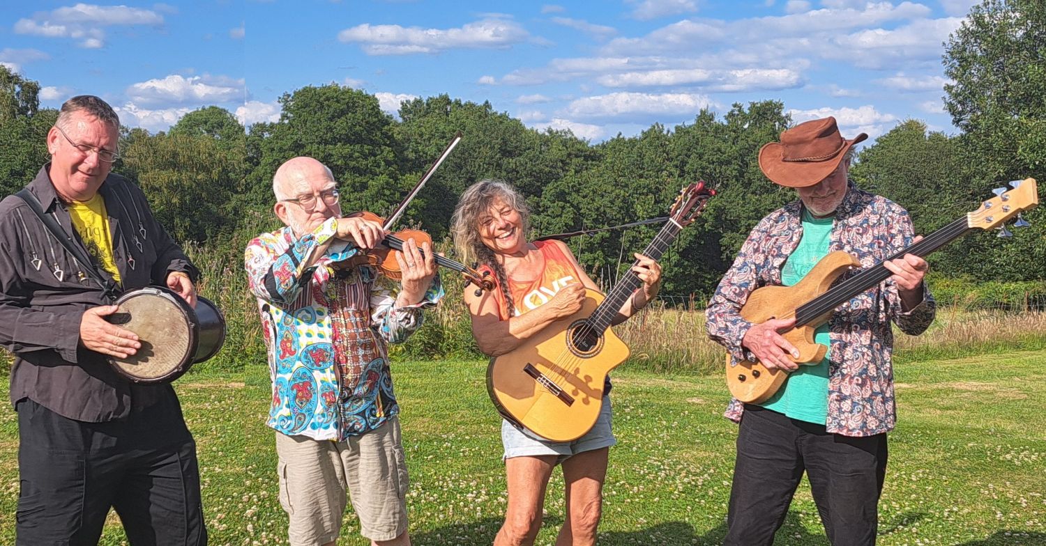 Based in mid-Wales since 2017, the current lineup of FiddleBop features Dave Favis-Mortlock on violin; Joanna Davies on Spanish guitar; Graeme Lamble on fretless electric bass; and Paul Midgley on percussion and junk flute. All of them sing. In 2024-5 FiddleBop played at several festivals, including Brecon Jazz Festival, Upton Jazz Festival, HowTheLightGetsIn at Hay-on-Wye, Tewkesbury Live, Llangollen Fringe, Landed Festival, and others.